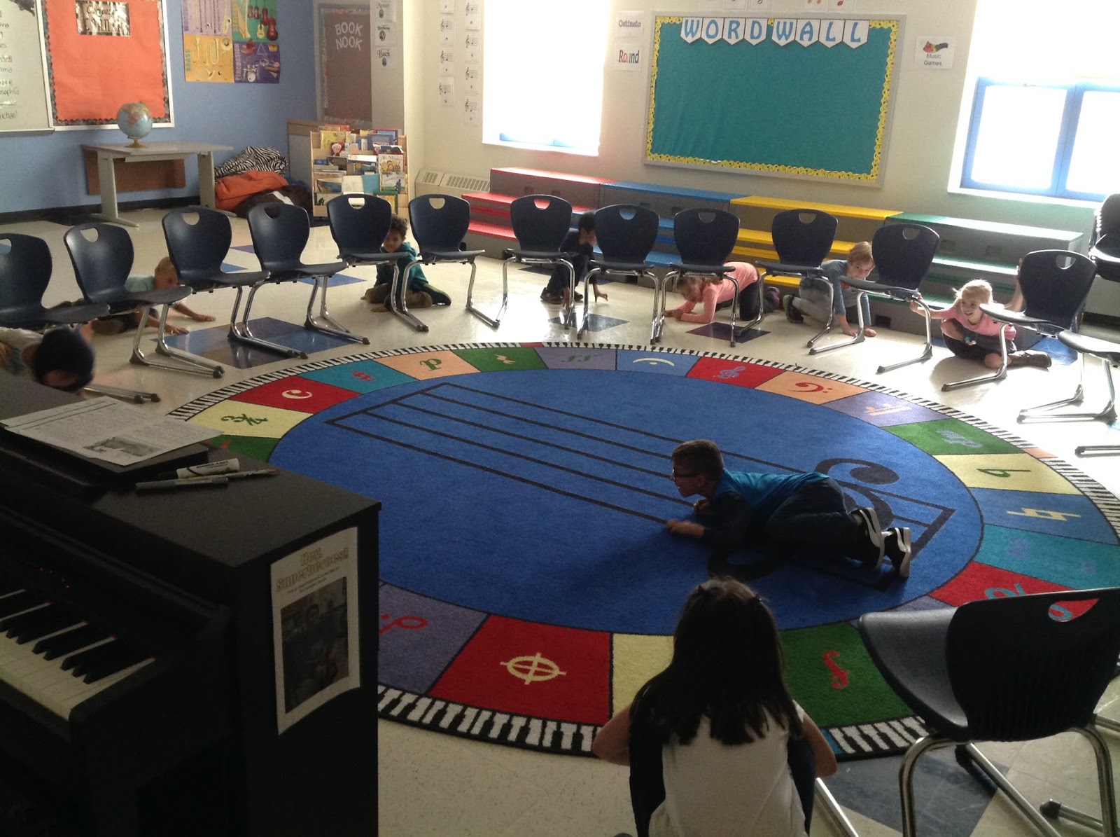 The fifth graders learned a great rhythm game called "Rhythm Spots." Four different colors were assigned to a different rhythmic value (blue = quarter rest, green = quarter note, yellow = eighth note, red = sixteenth note). We then had students walk along to the steady beat while listening to "In the Hall of the Mountain King," and when they got to a spot they had to perform four beats of that rhythm before walking away to a different spot. The tempo steadily increases in that piece of music, so they had to listen carefully to keep up with the beat!
